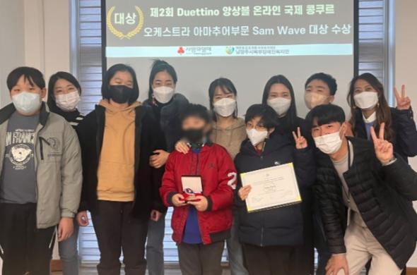 [한국뉴스타임=편집국] 남양주시북부장애인복지관은 지난해 12월에 개최된 ‘제2회 듀엣띠노 앙상블 온라인 국제 콩쿠르’ 오케스트라 아마추어 부문에서 대상을 수상한 ‘Sam Wave’ 오케스트라 단원 7명에게 지난 17일 상장을 전달했다.