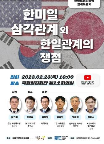 [한국뉴스타임=편집국] 국회 한반도평화포럼 공동대표인 김한정 의원(더불어민주당 남양주을)이 2월 23일 오전 10시 국회 의원회관 제2소회의실에서 ‘한미일 삼각관계와 한일관계의 쟁점 토론회’를 개최한다.
