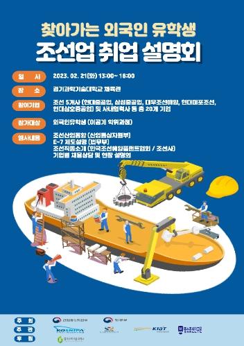 [한국뉴스타임=편집국] 산업통상자원부와 법무부는 외국인 유학생의 조선업 취업과 기업의 구인을 지원하기 위해, 2월 21일 경기과학기술대학교에서 ‘찾아가는 외국인 유학생 조선업 취업설명회’를 개최했다.
