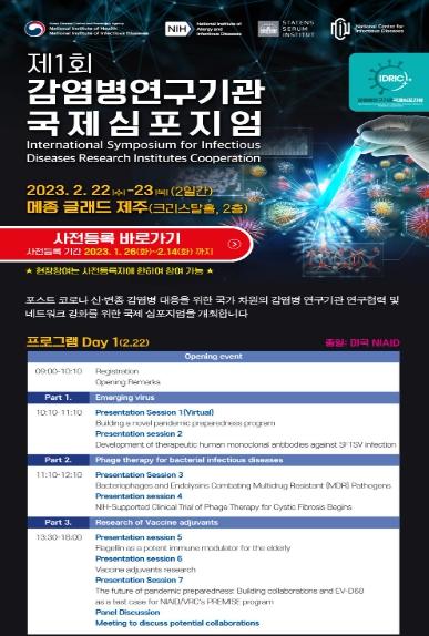 IDRIC 첫째 날(2월 22일(수))은 미국 NIAID 연구자들을 초청하여 전세계적인 감염병 유행 대비 방안, 신개념 치료제(Phage Therapy)에 대한 임상연구, 백신 면역증강제 연구 등을 다루며, 패널토의에서는 한-미 연구소 간 공동연구프로젝트에 대한 향후 공동연구 및 협력네트워크 구축에 대해서 심층 논의를 할 계획이다.