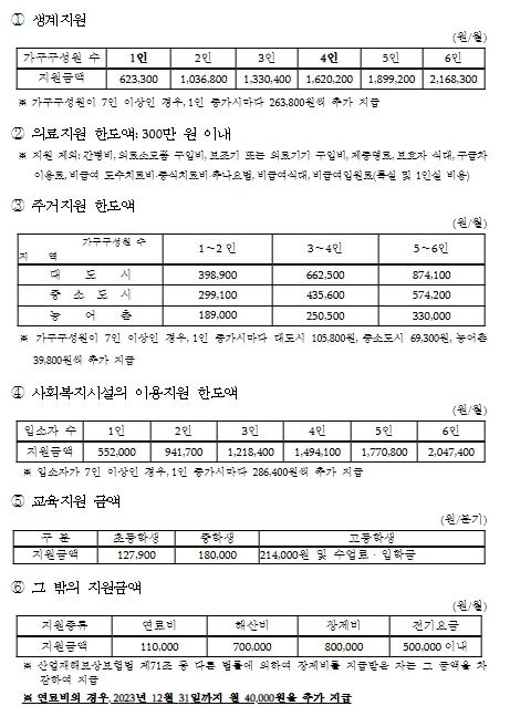 이번'긴급지원 지원금액 및 재산의 합계액 기준'고시 개정을 통해 연료비 월 4만 원을 추가 지원하며, 긴급지원대상 가구는 고시 시행일인 2023년 2월 22일부터 3월 31일까지, 10월 1일부터 12월 31일까지 월 15만 원의 연료비 지원을 받을 수 있다.