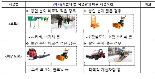 기존 간선도로 위주로 지정된 취약 구간은 도로 중심의 제설에서 인도, 이면도로 등 보행 공간까지 제설영역을 확대하고, 선정된 취약 구간은 기관별 여건에 맞게 담당자와 제설 우선순위를 선정하여 시설 종류별, 적설량별 등에 따라 제설 방법을 안내하고 있다.