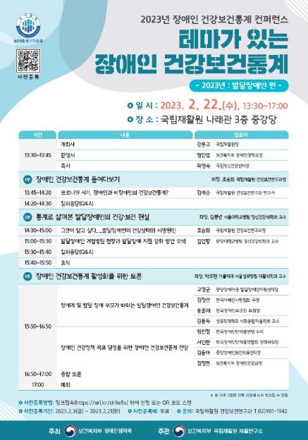 국립재활원(원장 강윤규)은 2월 22일 오후 1시 30분에 국립재활원 나래관(3층 중강당)에서 ‘테마가 있는 장애인 건강보건통계(2023년: 발달장애인 편)’를 주제로 학술회의(컨퍼런스, conference)를 개최한다고 밝혔다.