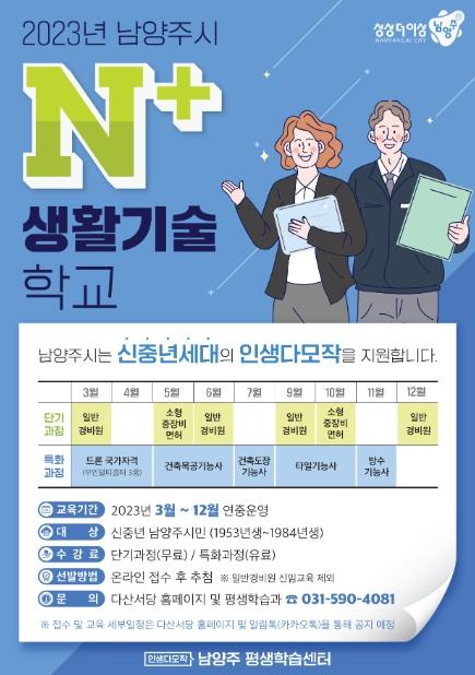 [한국뉴스타임=편집국] 남양주시는 오는 3월부터 신중년 세대의 취업 역량을 강화하고 안정적인 사회 정착을 지원하기 위해 ‘남양주플러스(N+) 생활기술학교’를 운영한다고 22일 밝혔다.