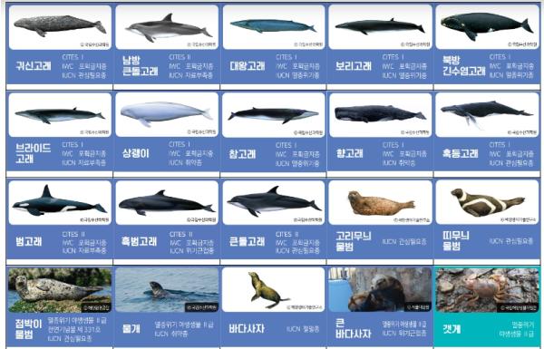 해양수산부는 ?해양생태계법?에 따라 ▲우리나라 고유종, ▲개체수가 현저하게 감소하고 있는 종, ▲학술적?경제적 가치가 높은 종, ▲국제적으로 보호가치가 높은 종 등을 “해양보호생물”로 지정하여 보호?관리하고 있다. 현재 우리나라에는 해양포유류 19종, 무척추동물 36종, 해조?해초류 7종, 파충류 5종, 어류 5종, 조류 16종 등 총 88종이 해양보호생물로 지정되어 있다.