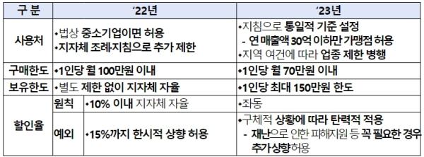 그간 1인당 구매한도는 월 100만원 이하의 범위에서, 보유한도는 별도 제한 없이 지자체별로 다르게 정해왔는데, 상품권을 대량으로 구매하고 쌓아둔 뒤 한 번에 고가의 재화·서비스 구매에 사용하는 등 정책 취지에 맞지 않는 사용 사례가 있었다.