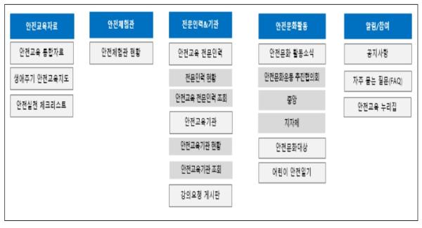 이용자 대상별 ?일반 ?보호자 ?강사 3개 영역으로 구분하여 제공되고, ?생활안전 ?교통안전 ?자연재난안전 ?사회기반체계안전 ?범죄안전 6개 분야로 나누어 필요 유형과 상황에 맞게 활용할 수 있도록 사용자 검색 편의성을 높였다.