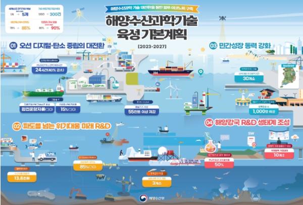해양수산부는 '제2차 해양수산과학기술 육성 기본계획(2023~2027)?을 수립하여, 친환경·자율운항 선박, 스마트 메가포트, 수산 블루푸드 등 미래 해양수산 산업 시장을 선점하기 위한 핵심 기술 확보를 위해 ‘27년까지 5조원 이상의 연구개발(R&D) 예산을 투입한다.