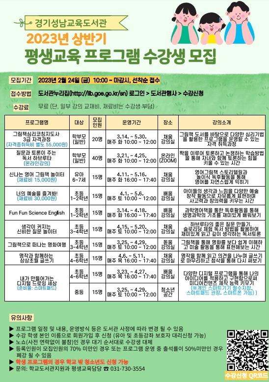 경기성남교육도서관(관장 직무대리 최주회)은 3월 14일부터 5월 30일까지 도내 학부모(일반), 유아(6~7세), 초등학생, 중학생을 대상으로 상반기 평생교육 프로그램을 운영한다.