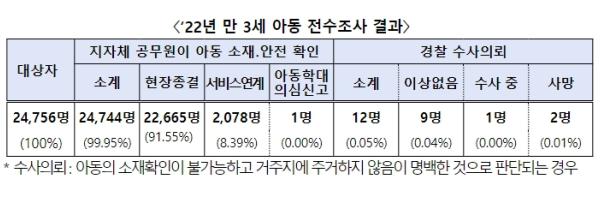 [한국뉴스타임=편집국] 보건복지부와 경찰청은 2022년 ?만 3세 아동 (2018년생) 소재?안전 전수조사?를 완료했다고 밝혔다.