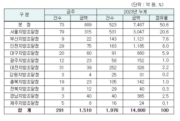 지역별 발주량을 보면 대전광역시 소재 본청 889억 원, 서울지방청 315억 원 등 2개청(1,204억 원)이 전체 금액(1,510억 원)의 79.7%를 차지하고 있으며, 인천 등 나머지 10개 지방청 306억 원이 각각 집행될 예정이다.