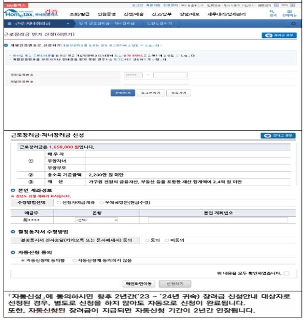 자동신청이 됐는지 여부는 국세청에서 장려금 신청기간에 문자로 안내할 예정이며, 장려금을 받으면 자동신청 기간이 2년 연장된다.