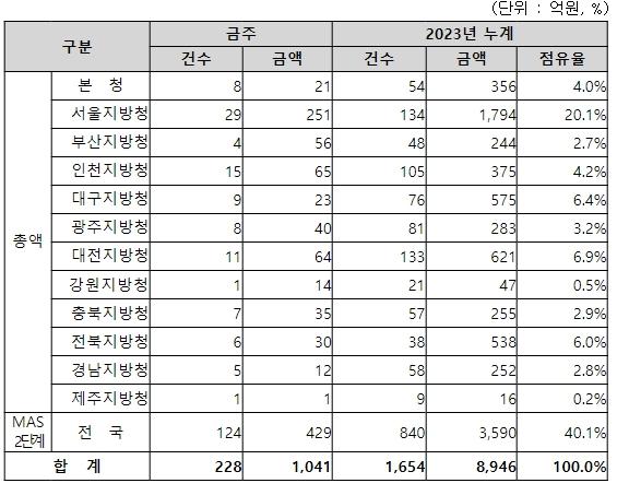 지역별 발주량을 보면, 총액계약 대상 612억 원 중 본청이 21억 원으로 3.4%를 집행하고 서울청 등 11개 지방청에서 591억 원을 각각 집행할 예정이다.