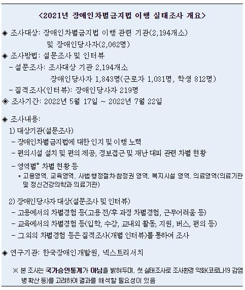 장애인차별금지법 이행 실태조사는 2020년 개정 시행된'장애인차별금지 및 권리구제 등에 관한 법률'제8조의2 및 같은 법 시행령 제4조의2에 따라 3년마다 실시하는 것으로, 이번 실태조사는 처음으로 실시됐다.