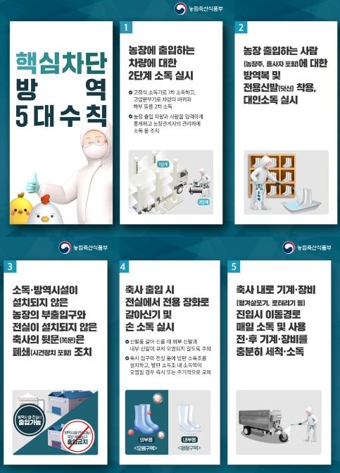 김인중 농림축산식품부 차관은 “농가에서는 야생동물(쥐, 고양이 등)의 축사 출입 때문에 발생할 수 있으므로 환기창에 차단망 설치, 주기적인 구서 작업 등 관리를 강화하면서, 농장 내 소독을 매일 실시하는 등 5대 차단 방역수칙*을 철저히 준수하여 줄 것”을 강조했다.