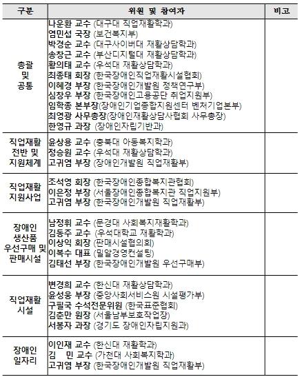 추진단은 대구대학교 나운환 교수와 보건복지부 염민섭 장애인정책국장이 공동단장을 맡고, 관련 협회?학계?현장전문가?관계기관 등 30명의 위원들로 구성되어있다.