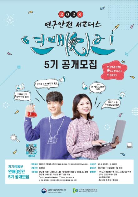 [한국뉴스타임=편집국] 과학기술정보통신부는 자율적인 연구실 안전문화 확산을 위해 2월 27일부터 3월 22일까지 2023년도 연구안전 서포터스 ‘연애인’(연구실 안전을 사랑(愛)하는 사람(人))을 공개 모집한다.