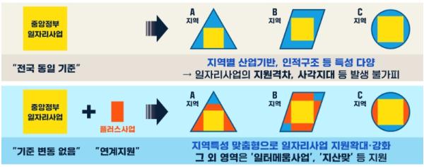 ?지역형 플러스(PLUS) 사업?은 자치단체가 주도하여 지역의 산업 특성에 맞게 기존 중앙정부의 일자리사업 지원수준을 높이거나 지원요건을 확대하는 등 지역과 중앙의 정책 연계하여 다음과 같이 시행된다.