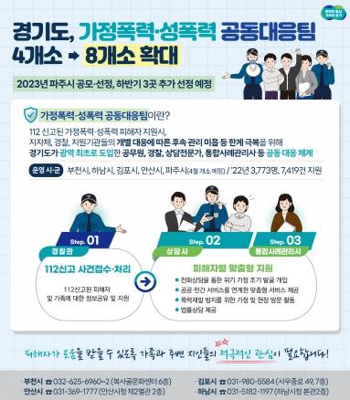 경기도는 2021년 11월 경기남부·북부경찰청과 업무협약을 체결한 이후 ▲2021년 부천시, 하남시 ▲2022년 김포시, 안산시 ▲2023년 2월 1일 파주시를 선정하는 등 공동대응팀을 확대했고, 올 하반기 3곳을 공모로 추가 선정할 계획이다.