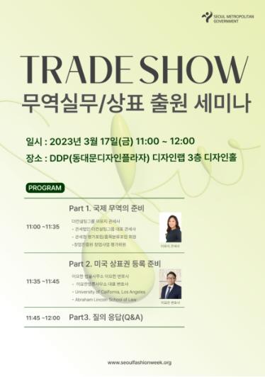서울패션위크 트레이드쇼의 ‘무역 실무/상표출원’ 세미나의 참여를 원하는 사업자나 개인은 서울패션위크 트레이드쇼 누리집 사전 등록을 통해 2월 25일(토)부터 신청하면 된다.