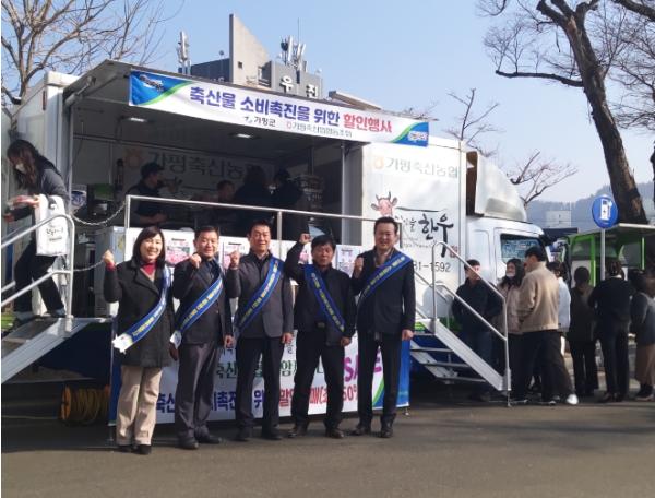 이 기간 가평군청 주차장 내에 마련된 축산물 이동 판매차량에는 공무원과 지역주민 등이 줄을 이으며, 한우 등심?불고기?사태를 비롯해 돼지 삼겹살?목살?전지, 한우곰탕 등을 기존 판매가격 대비 최대 50%이내 할인된 가격에 구입했다.