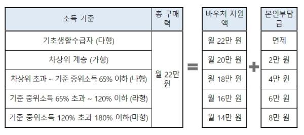 기준 중위소득 120% 이하 가구의 만 12세 미만 비장애 아동으로서 한쪽 부모 또는 조부모(조손가정)가 등록장애인*인 경우 월 최대 22만 원의 정부지원금을 바우처로 제공한다.
