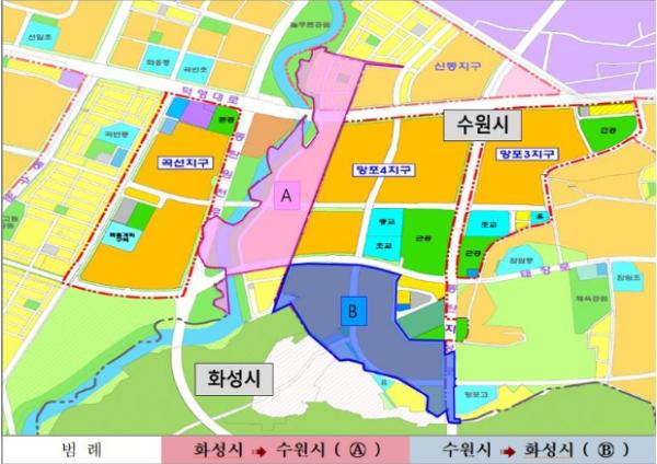 수원시와 화성시는 수원 망포동 일원과 화성시 반정동 일원을 동일면적(19만 8825㎡)으로 교환할 예정이다.