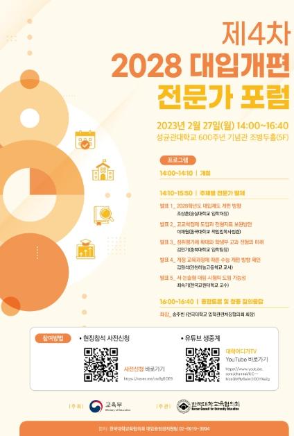 [한국뉴스타임=편집국] 교육부는 한국대학교육협의회(회장 홍원화)와 함께 '제4차 2028 대입개편 전문가 토론회(포럼)'를 2월 27일, 성균관대학교에서 개최한다.
