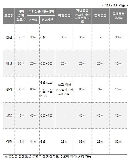 전라남도교육청은 농어촌 및 소규모 학교가 많은 지역적 특성을 고려하여 양질의 방과후 프로그램을 중점적으로 지원하는 ‘농어촌형’과, 다양한 돌봄을 중점적으로 지원하는 ‘도시형’으로 운영체제를 구축하여 43개 초등학교를 대상으로 시범 운영한다.