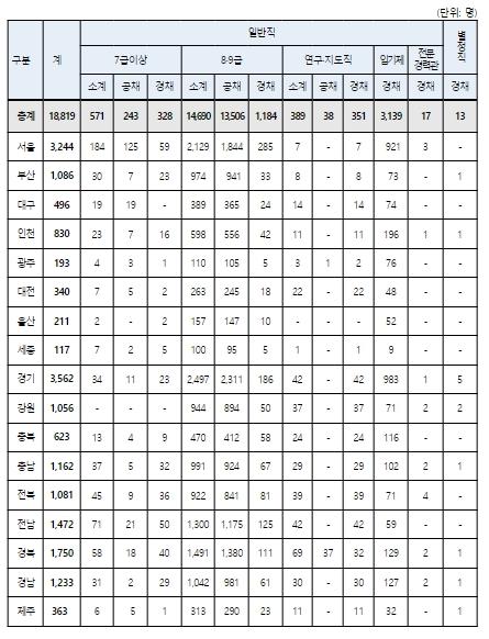 직종별로는 일반직공무원 18,806명과 별정직공무원 13명을 선발하며, 이 중 일반직은 7급이상 571명, 8?9급 14,690명, 연구·지도직 389명, 임기제 3,139명, 전문경력관 17명이다.
