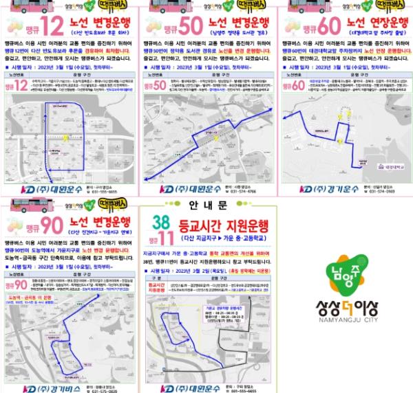 또한, 땡큐12번은 임시 우회 노선 기점이 다산롯데캐슬에서 반도유보라메이플타운으로 변경되며, 땡큐50번은 정약용도서관을 경유하는 것으로 변경 운행된다. 땡큐90번은 현재 도농역~금곡동 노선이 단축돼 가운지구를 경유하는 노선으로 변경된다.