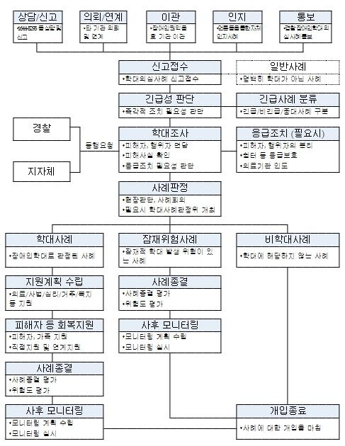 '장애인복지법'은 장애인학대현장에 출동한 장애인권익옹호기관의 직원이나 사법경찰관리가 학대받은 장애인을 학대행위자로부터 분리하거나 치료가 필요하다고 인정할 때 법률에서 정한 기관에 인도하도록 하고 있다.