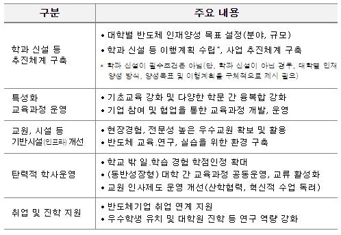 교육부는 반도체 인재양성 역량과 의지를 갖춘 대학을 선정하여, 대학별로 교원 인건비, 교육시설 및 장비 구축, 기업 협업 등 반도체 인재양성 계획 이행에 필요한 재정을 포괄적으로 지원할 계획이다.
