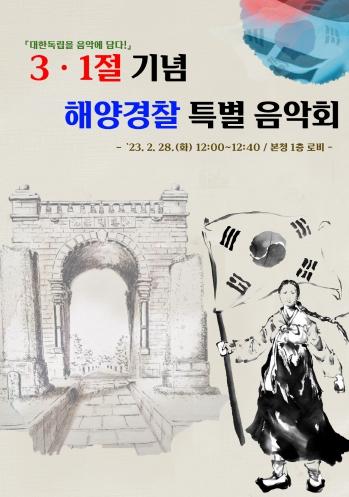 [한국뉴스타임=편집국] 해양경찰청은 제104주년 삼일절을 맞아, 삼일절의 숭고한 의미와 선조들의 희생을 되새기기 위해 28일 해양경찰청 관현악단의 특별 음악회를 개최했다고 밝혔다.