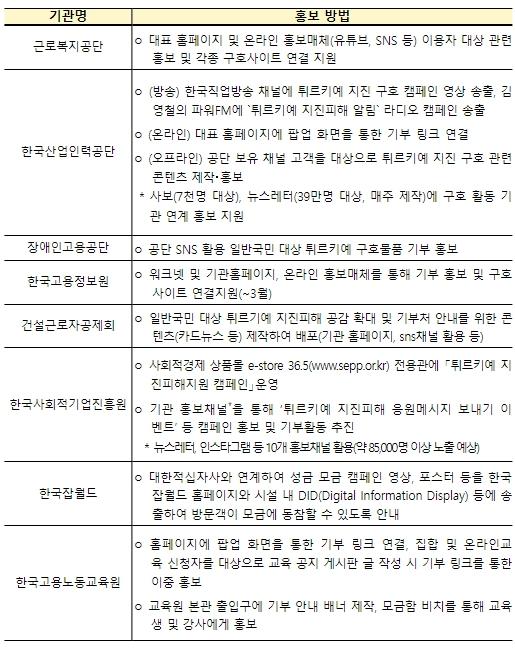 고용노동부는 튀르키예 정부가 요청한 우선순위 물품을 구매·기부하고, 기타 물품은 현지 상황을 고려하여 전달한다고 밝혔다.