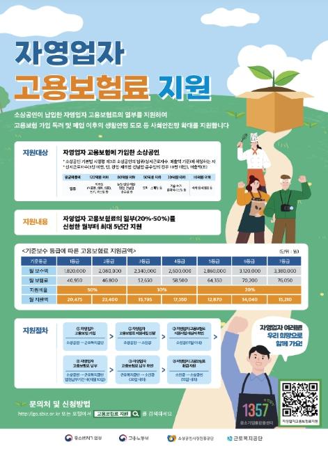 자영업자 고용보험은 사업장을 운영하는 사업주가 실업급여, 고용안정 및 직업능력 개발지원 등의 혜택을 받을 수 있는 제도로, 중소벤처기업부는 고용보험에 가입한 소상공인의 보험료 납부 부담 완화를 위해 보험료의 일부(20~50%)를 최대 5년간 지원하고 있다.