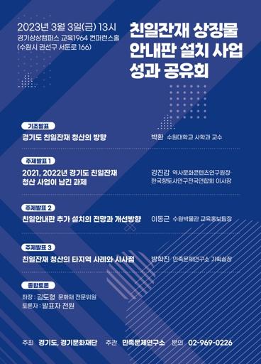 경기도, 경기문화재단이 주최하고 민족문화연구소가 주관하는 ‘친일잔재 상징물 안내판 설치 사업 성과공유회’는 3월 3일 13시 경기상상캠퍼스 교육1964 컨퍼런스홀에서 개최한다.