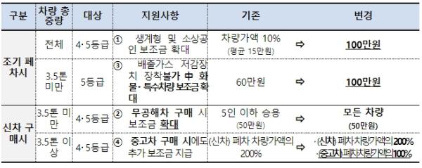 환경부는 조기 폐차를 적극 유도하기 위해 생계형(기초생활수급자ㆍ차상위계층) 및 소상공인 차주에 대한 보조금을 기존 차량가액의 10%(평균 15만 원)로 정률 지급하던 방식에서 정액 100만 원으로 확대하여 지급한다.
