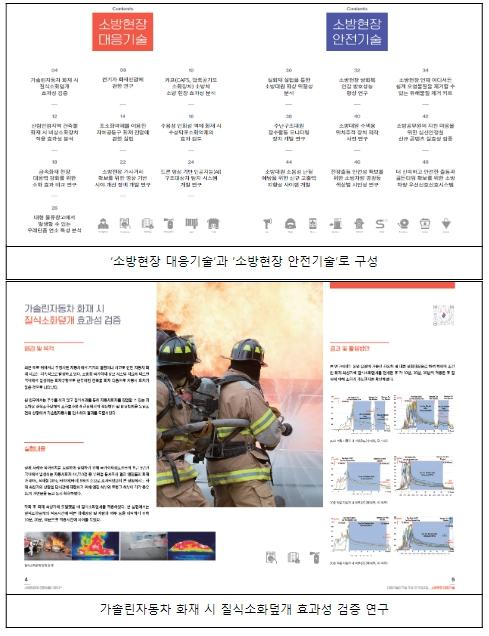 소방현장 대응기술 분야에는 최근 증가하고 있는 전기차 화재와 관련하여 전기차 화재 진압에 관한 연구, 금속화재 연구를 비롯해 지하공동구 화재진압을 위한 포소화약제 실·검증 실험 및 드론 활용 인공지능(AI) 구조대상자 탐지 시스템, 농연 상황 극복을 위한 시야 개선 장비개발 등의 연구성과를 수록했다.