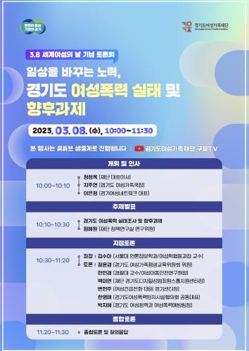 토론회에서는 ‘경기도 여성 폭력 실태조사’의 연구 책임을 맡은 정혜원 재단 정책연구실장이 연구 결과를 발표한다. 이어 김수아 서울대 언론정보학과 교수가 좌장을 맡아 정윤경 경기도 여성가족평생교육위원회 위원, 한민경 경찰대 교수, 백미연 재단 경기도디지털성범죄원스톱지원센터장, 변현주 여성긴급전화 1366 경기센터장, 한영애 경기도여성폭력방지시설협의회 공동대표, 박지혜 경기도청 여성폭력예방팀장이 토론에 참여한다.
