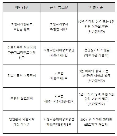 이는 무면허 의료행위(의료법), 자동차보험 진료기록부 거짓작성(자배법) 등의 위반될 소지가 있으며, 국토교통부는 관련 법령*에 따라 해당 의료기관을 형사고발 할 계획이다.