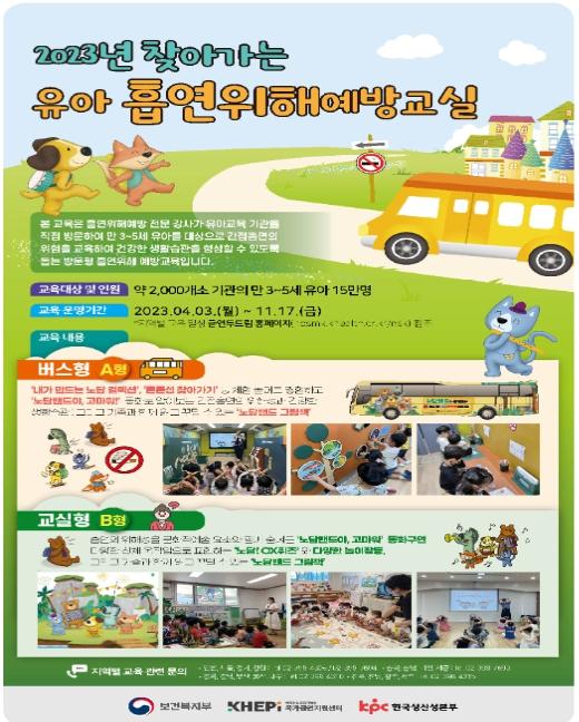 ‘찾아가는 유아 흡연위해예방교실’은 ‘버스형’교육과 ‘교실형’교육으로 진행하며, 3월 3일부터 17일까지 2주간 어린이집과 유치원 참여기관의 신청을 받는다.