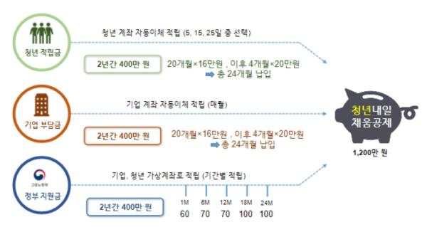 ② 적립구조 및 지급방식은 2년간 청년?기업?정부가 각각 400만원을 공동으로 적립하여 총 1,200만원을 만기 시에 청년에게 지급하게 된다.