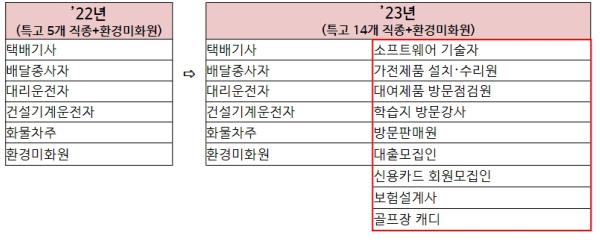 기존 지원 대상은 택배기사, 배달종사자, 대리운전자, 건설기계운전자 및 화물차주 총 5개 직종이었으나, 올해부터는 ?산업안전보건법 시행령? 제67조에 따른 특수형태근로종사자 14개 직종 전체로 지원 대상이 대폭 확대된다.