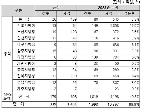 지역별 발주량을 보면, 총액계약 대상 843억 원 중 본청이 189억 원으로 22.4%를 집행하고 서울청 등 11개 지방청에서 654억 원을 각각 집행할 예정이다.