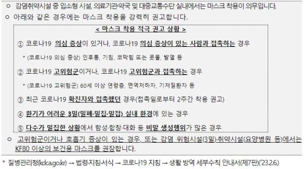 참고로 중앙방역대책본부(질병관리청)에서는 코로나19 고위험군이거나 감염 위험·취약시설에서는 KF80 이상의 보건용 마스크 착용을 권고하고 있다.