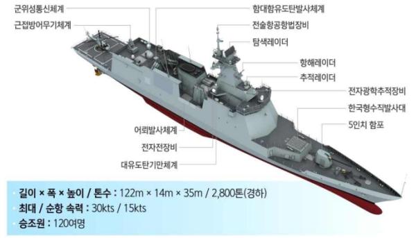 길이 122미터, 폭 14미터, 높이 35미터의 2,800톤급 전투함으로, 5인치 함포, 함대함유도탄, 근접방어무기체계 등을 갖추고 있으며, 해상작전헬기 1대를 운용할 수 있다.