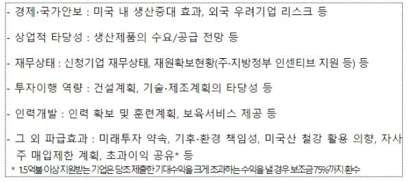 美 상무부는 기업들이 제출한 신청서를 경제?국가안보, 투자계획의 상업적 타당성, 신청기업의 재무상태 및 투자이행 역량, 인력개발 및 그 외 파급효과 등의 여러 측면에서 종합적으로 검토하게 되며,이에 대한 기업과의 심층적인 논의?협상을 거친 후 인센티브 지원 규모?방식 등을 확정하게 될 것이다.