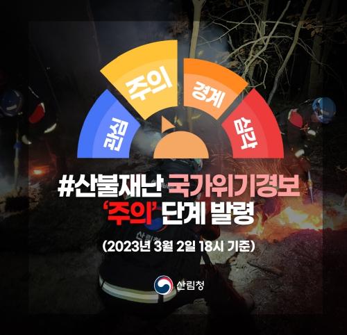 [한국뉴스타임=편집국] 산림청은 최근 전국적으로 건조한 날씨가 지속되며 강원도 지역에 강풍 예비특보가 발효되는 등 산불 발생위험이 커짐에 따라 3.2일 18시부로 강원·경북 동해안 지역의 산불재난 국가위기경보를 ‘주의’ 단계로 상향 발령했다.