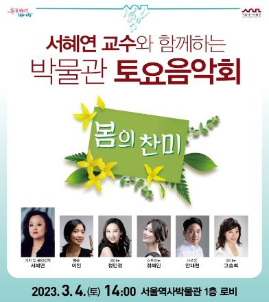 서울역사박물관(관장 김용석)은 최고의 음악가와 전문가의 해설로 클래식에 대한 문턱을 낮춘 2023년'박물관 토요음악회'를 3월 4일 오후 14시 박물관 로비에서 첫 연주회 '봄의 찬미'로 막을 올린다.